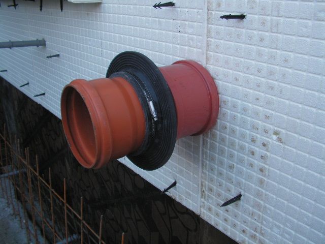 Detailansicht der Wanddurchführung Aus einem KG-Rohr Ø 150mm und einer Überschubmuffe wird eine Wanddurchführung erstellt. Darauf wird ein fertiger Dichtungsflansch eingebaut |