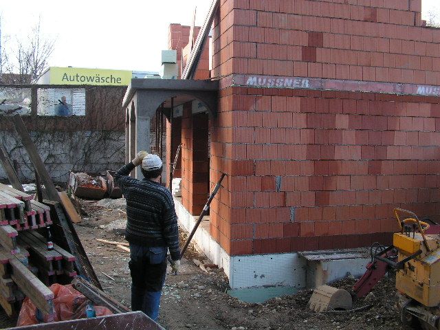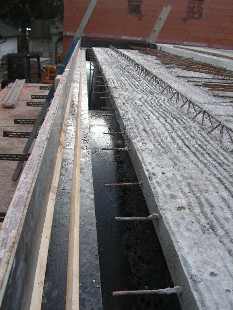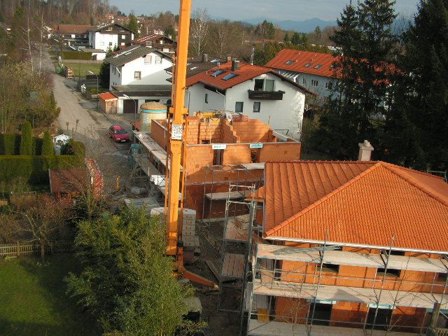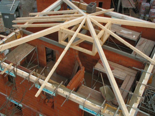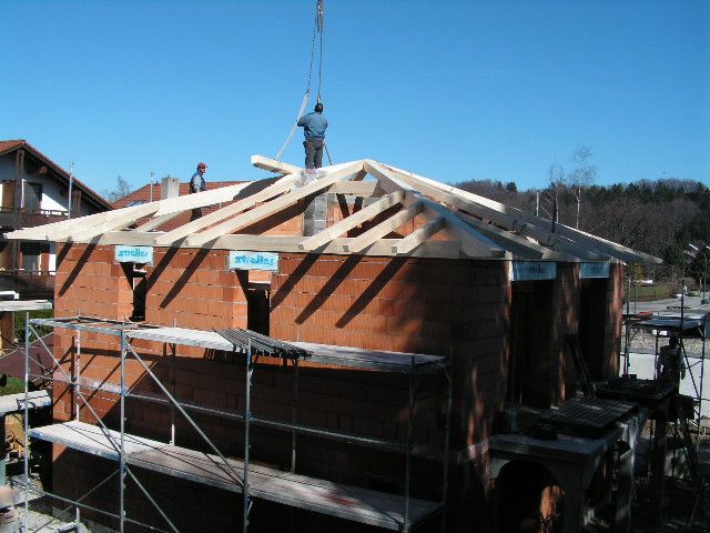 Hier ist der Dachstuhl schon aufgesetzt. Der Ringanker wurde erst nachträglich anbetoniert. |