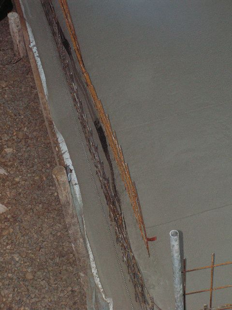 Die fertig abgezogene Bodenplatte mit Anschlussbewehrung und Arbeitsfugenband. |