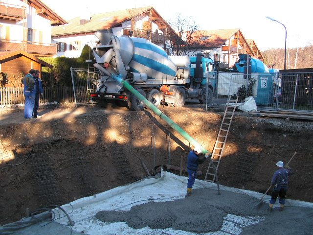 Der Beton für die Bodenplatte wird über ein Rohr eingelassen. |