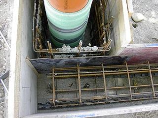 Detail einer Aussparung aus KG-Rohr mit Schaumstoffumwicklung; Höhenausgleich. |