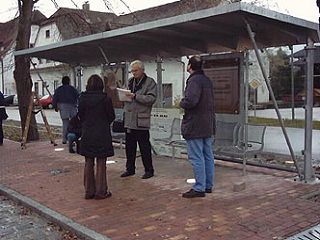 Das Wartehäuschen bei der Abnahme. v. l. n. r. Elektro Ackermann; Gemeinde Fr Bresch; Architekt Dietrich; Stahlbau Hopf |