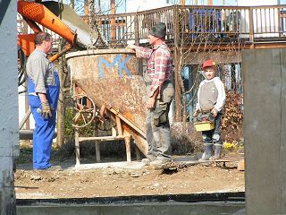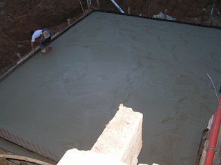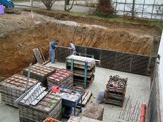 Die Bodenplatte wurde auf eine Lage PE-Folie, Drunterleisten und 2 Lagen Bewehrung erstellt. Auch eine Wand - Anschlussbewehrung, ein Fundamenterdungaband und ein Arbeitsfugenband wurden eingebaut. | |