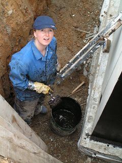Die Kellerwände sind fertig. Die Mauerstärken werden zusätzlich mit Bitumen - Dickbeschichtung gespachtelt. |