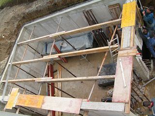 Stützwände und Treppenwände werden geschalt und betoniert. |