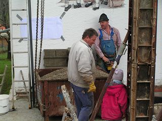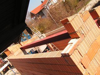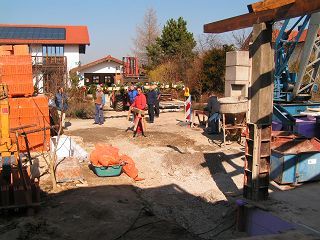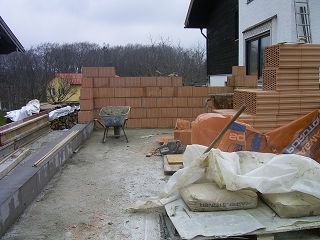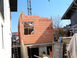 Die Garage mit dem Grundputz. Während den Putzarbeiten mussten die Arbeiten unterbrochen werden, weil die Stadt die Erschließungsstraße erneuerte. Erst nach mehreren Monaten konnte wieder weiter gebaut werden. |