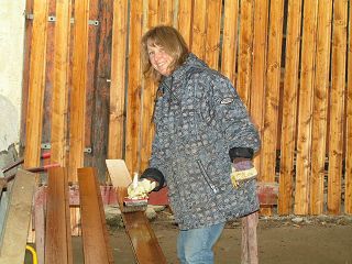 Die Bauherrin wieder beim streichen der Vordachbretter. |