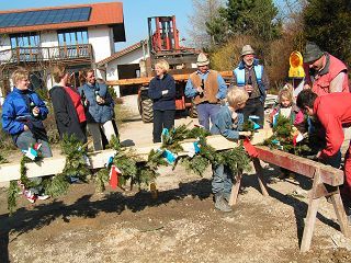Die Firstdiebe hatten in der Nacht den Firstbaum gestohlen. Der Verdacht, das es die Nachbarn waren bestätigte sich. Als dann unsere Not bekannt wurde brachten sie das Gute Stück mit Girlanden geschmückt zurück. Doch ohne Lösegeld wollten sie das Holz nicht raus rücken. Um ihrer Forderung mehr Nachdruck zu verleihen wurde gedroht den First in Stücke zu Brennholz zu schneiden. Da alle Angebote zu schlecht waren wurde dann auch kurzerhand ein Stück abgeschnitten. Das mag einen Fremden vielleicht noch schocken, aber als alter Baufuchs weis man, das bei solchen Aktionen das Kantholz mit einem Abfallholz vorher verlängert wurde. Der Übergang wird dann mit den Girlanden dekoriert. |