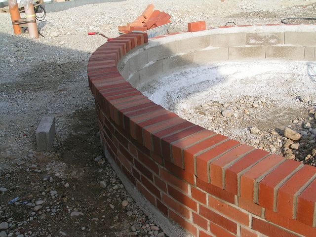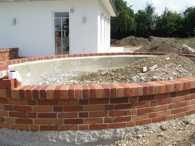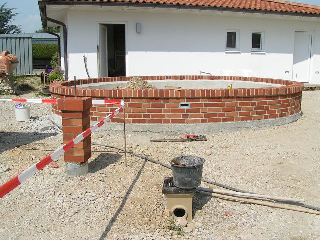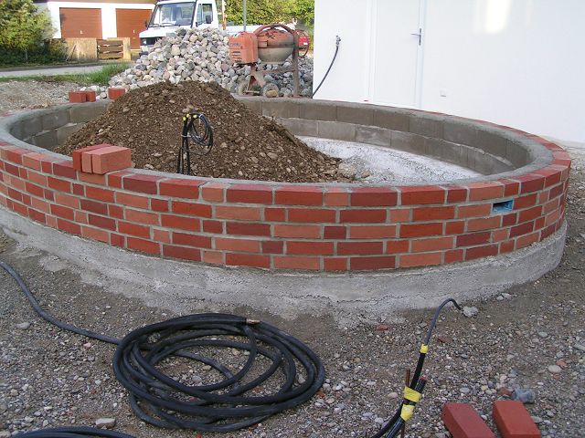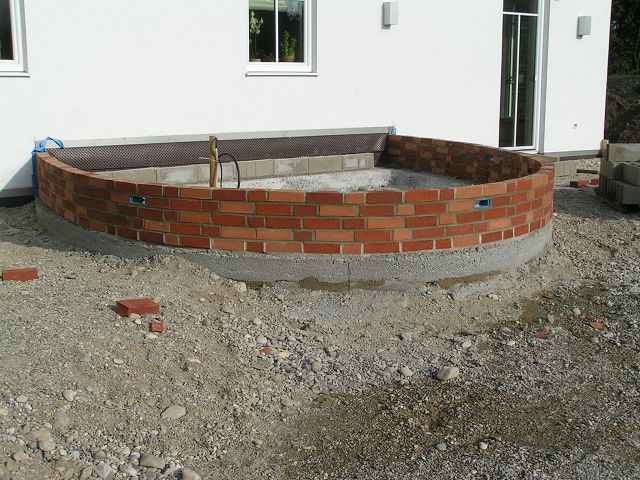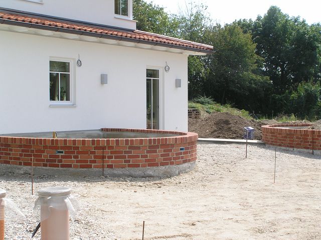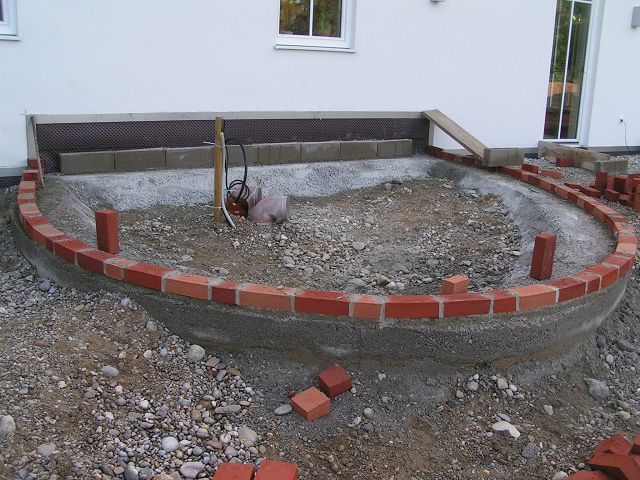 In Burghausen haben wir vom Bauherrn Sch. den Auftrag für Maurerarbeiten erhalten. Zur Gartengestaltung wurden 3 Elypsen als erhöhte Pflanzbeete erstellt. Diese wurden aus drei verschieden farbigen "Handschlagziegeln" gemauert. Diese Steine sind absolut Frostbeständig, aber auch kantig, buckelig und rund. So manchen Stein muss man da aussortieren. Es wurde ein 1 Kopf und 2 Läufersteinen schichtweise abwechselnd vorgegeben. |