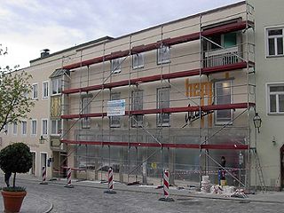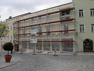 ein Gerüst aufgestellt. Die Sicherungsmasnahmen für Fußgänger und die