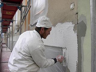Durch milde Witterung im Februar 2002 konnte um die Erdgeschossfenster der Grundputz angebracht werden. | |