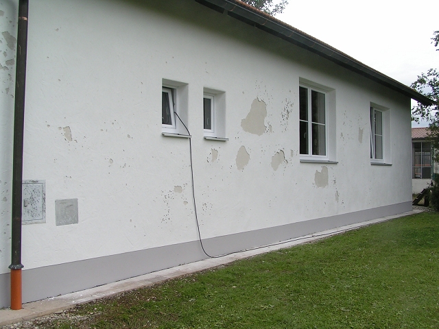 Sie sehen die Westseite des Landjugendheimes Emertsham. So sah die Fassade aus, als ein Hagelunwetter das Gebiet heim suchte. Die aufprallenden Körner lösten den Oberputz vom Grundputz. Das hatte 2 Ursachen. Zum Einen deshalb, weil unter dem Grundputz ein 10 cm dicker Vollwärmeschutz sich befindet. Zum Anderen daran, das der Vollwärmeschutz und der Putz erst 14 Tage alt war. Der Mörtel hatte noch nicht seine komplette Festigkeit erreicht. Wir haben daraufhin den gesamten Oberputz wieder abgeschlagen, noch mal eine Putzschicht mit Gewebe aufgebracht und eine neue Struktur aufgeputzt. Glück auf ! |