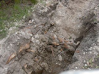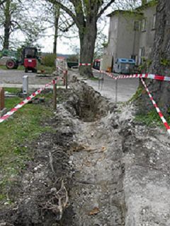 Bei ca 30 bis 50 cm tiefe waren die Wurzeln in den Friedhof vorgedrungen. Hier hatten sie sich auch schon unter der Grabsteinen hindurchgearbeitet und behinderten auch den Totengräber beim Grab freilegen. | ||