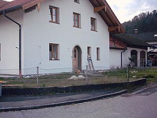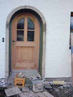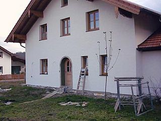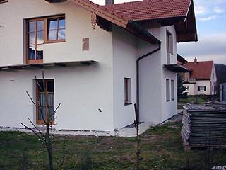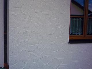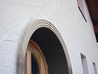 Bei diesem Einfamilienhaus wurden die Außenputzarbeiten durchgeführt. Auf das Vollwärmesystem wurde von uns ein Haft - und Armierungsgrundputz mit Gewebeeinlage erstellt. Nach vier Wochen Trocknungszeit wurde Der Strukturputz Hasit 730 mit 3,5mm Körnung aufgebracht. Die Haustür, eine Rundbogentür ,wurde von der Rohbaufirma S. aus Engelsberg zu niedrig gebaut. Deshalb wurde eine Lösung gesucht, diese optisch höher wirken zu lassen. Mit einem Stuckprofil wurde hier die richtige Lösung gefunden. Das Profil wurde mit den Bauherrn entwickelt und zeichnerisch fixiert. Ein Subunternehmer fertigte die Einzelteile an. Diese wurden von uns montiert und verspachtelt. |