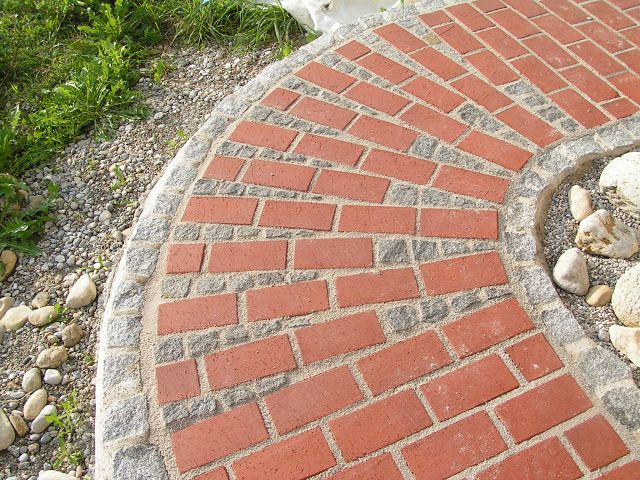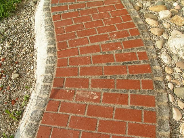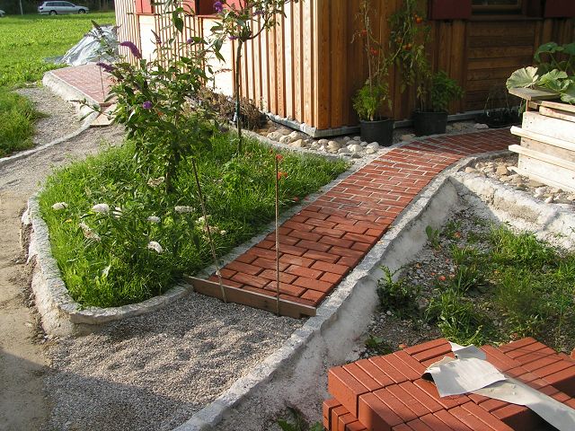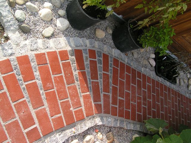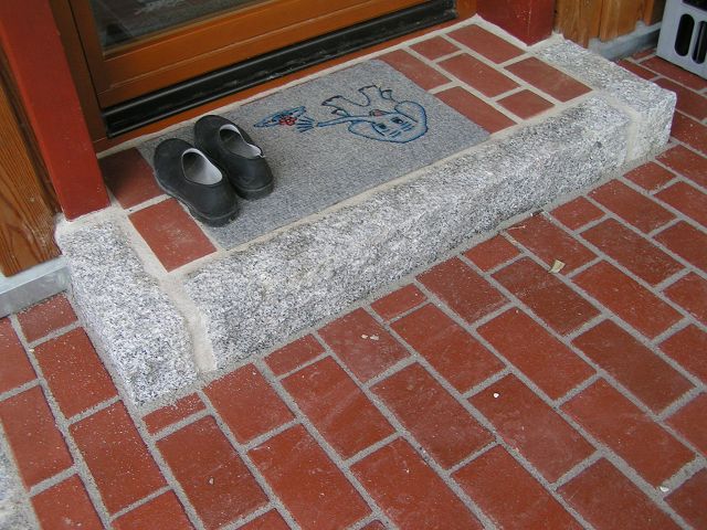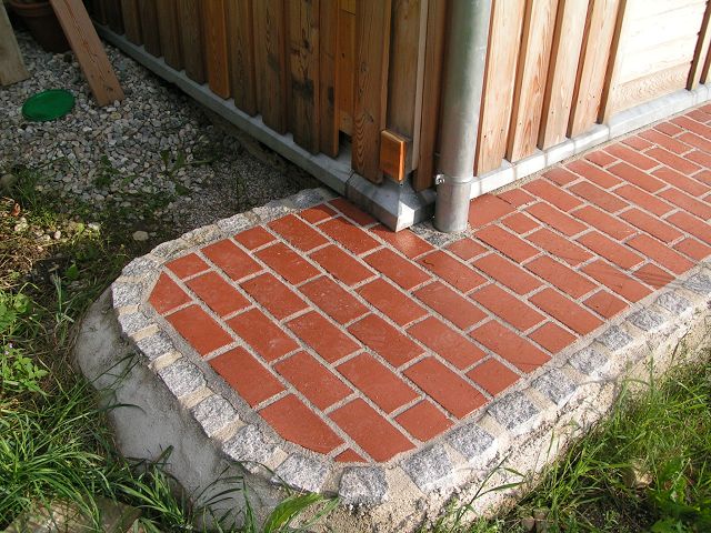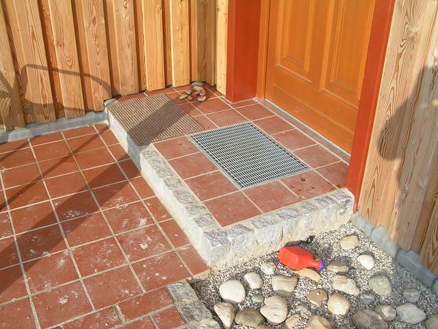 Bei der Haustür haben mit Granitwürfeln eingefasst und die Fläche mit 2 cm dicken Ziegelplatten ausgelegt. | |
