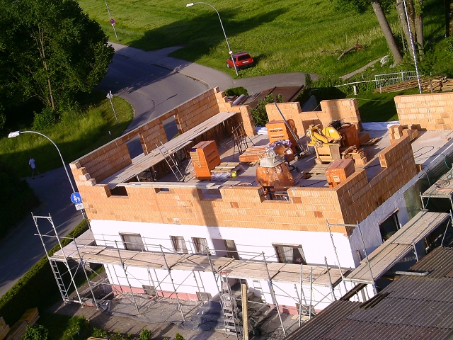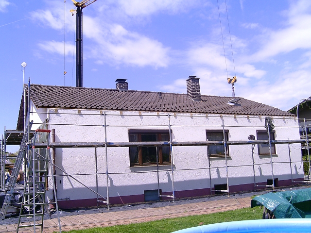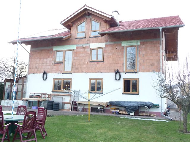 So sah das Häuschen der Familie Schatzeder aus Tacherting vor der Aufstockung aus. Ganz unten sieht man den jetzigen Zustand. Das Bauwerk aus den 60er Jahren war für die vierköpfige Familie mit 4 Zimmern und einem Bad zu klein geworden. Nach reiflicher Überlegung wurde von uns ein Plan zur Aufstockung eingereicht. Dabei war auch schon vorgesehen den Altbau thermisch zu sanieren. Wie sich herausstellte eine weise Entscheidung. Das Haus war damals mit Betonsteinen erstellt worden. Hatte eigentlich Null Dämmwirkung. Das ganze Konzept wurde durch die Energieberaterin Natalie Schlederer aus Altötting noch berechnet. Dadurch wissen wir, das 14cm VWS angebracht werden müssen. Die Arbeiten wurden in Regie ausgeführt, weil der Bauherr viel Eigenleistung machen wollte. Die Bauherrn wollten im Haus wohnen bleiben. Deshalb musste die Aufstockung sehr schnell gehen. |