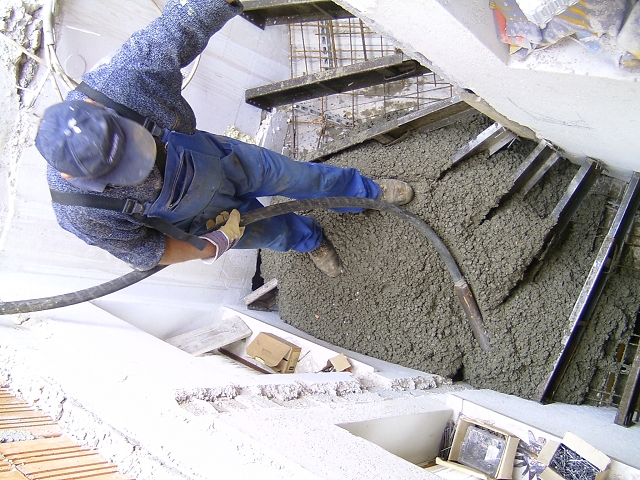 Mit dem Betonrüttler wird der steife Beton verdichtet und nach unten getrieben, bis die Stufenschalungen voll sind. |