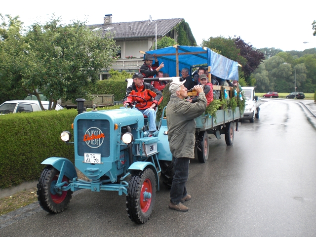 Dann hörte man das tuckern eines alen EICHER Dieseltraktors - entfernte sich wieder, um dann aus einer anderen Straße wieder zu erklingen. Na endlich, da kommen sie. In sicherer Entfernung blieb das blaue Gespann stehen. Dann freche Frage " Brauchts was? Geht euch was ab? Suchts was? Nein - wir haben eh keine Zeit wir müssen noch schnell zum Wirt fahren." Und weg waren sie wieder. Wieder weiter warten |