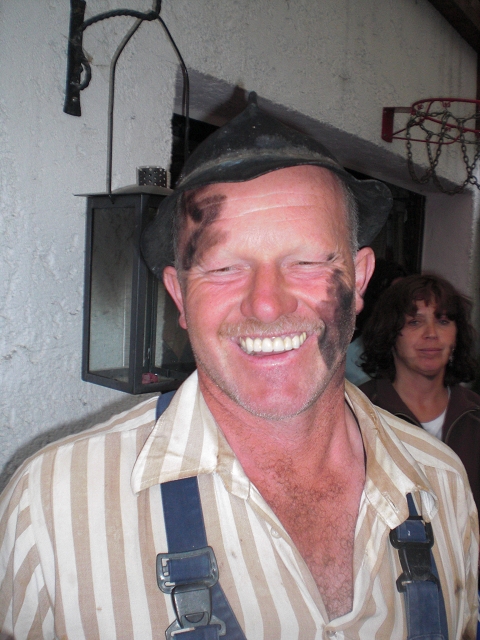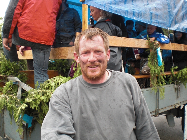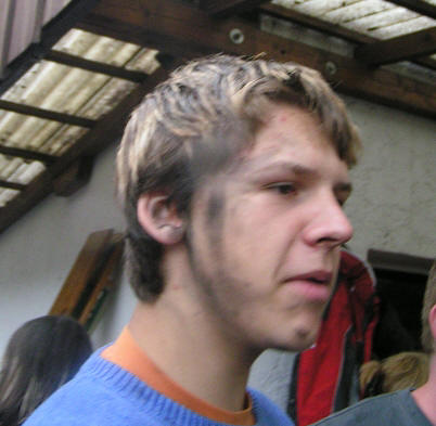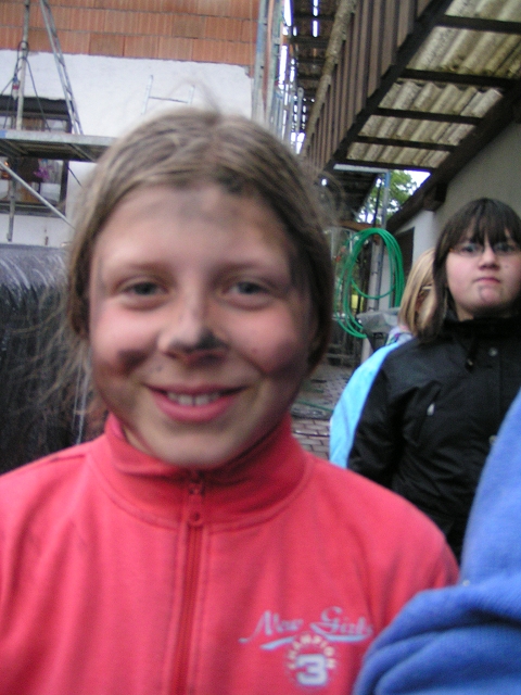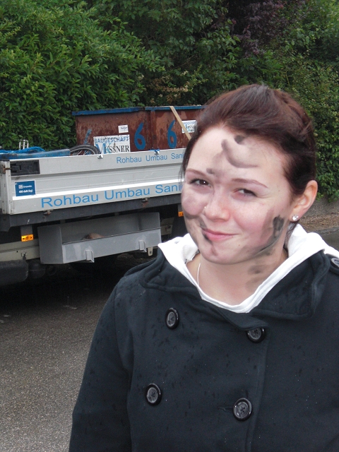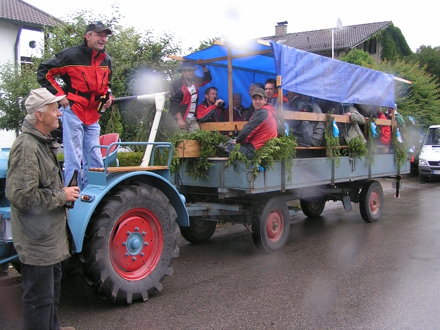Nun ja, es dauerte noch eine geraume Zeit, bis die "Diebe" erneut kamen und sie für Brotzeit und Getränke das Bauholz wieder zurück gaben. Hier ging es dann ein bisserl hektisch her, weil man den Ruß aus dem Auspuffrohr des Eicher Traktors auf den Gesichtern der Beteiligten verteilte. Nur wenige blieben dabei verschont. Zu guter Letzt habe ich auch hier noch einen Richtspruch auf dem First oben gesprochen. |