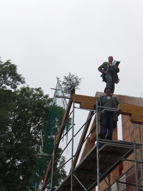Warten auf das letzte Firstholz. Die Nachbarn waren in der Nacht beim stehlen da. Der Bauherr Franz fragte die umliegenden Nachbarn ab, ob sie etwas gesehen hätten, und das der Zimmerer das Bauhoz nun dringend brauche, da er sonst den Bau nicht fertig machen könnte. Bis man ein neues Kantholz bekommt können Wochen vergehen. Es gab so Gerüchte, das man zwar etwas wisse, aber nichts genaues, man solle einmal den Nachmittag abwarten. Also abwarten. Dann kamen auch noch ein paar Nachbarinnen, die warteten auch mit. | |