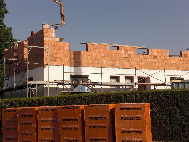 Die ersten Ziegelreihen sind schon gemauert. | |