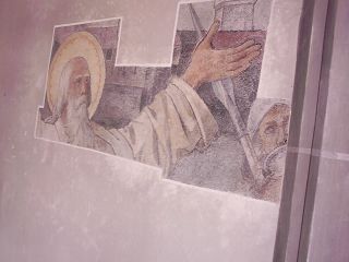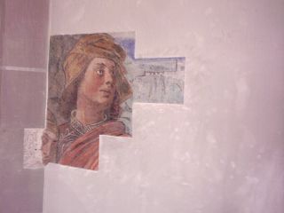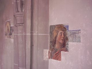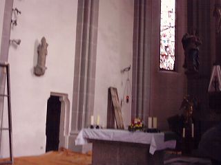 Der Heimatpfleger hatte auf dem Flohmarkt Fotos erstanden, die Bilder in der Pfarrkirche St Andreas im Altarraum zeigen. Daraufhin wurde weiter geforscht. An der rechten Altarseite war ein Gemälde sichtbar. Das lies die Vermutung zu, das an der linken Altarseite die Bilder mit Kalkfarbe überstrichen wurden. Bauliche Veränderungen machten es anscheinend notwendig. Um das Ausmaß der Veränderungen feststellen zu können mußte man in ca 6,00meter Höhe Mauerwerk und Farbe untersuchen. Zu diesem Zweck wurde von uns ein Gerüst aufgestellt. |