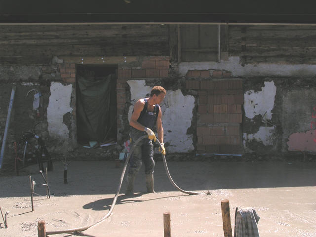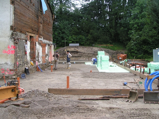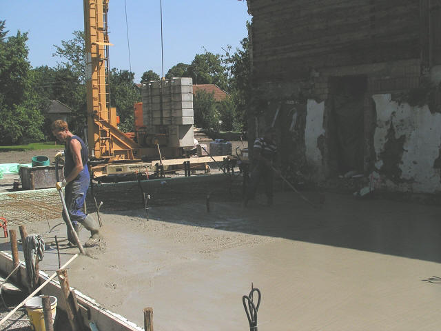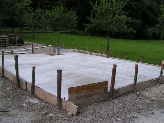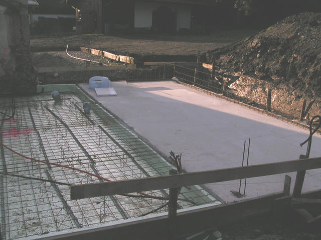Die Bodenplatte der Garage wurde neben her einmal betoniert. Auch hier gab es vorher noch jede Menge Ver- und Entsorgungsleitungen einzubauen. Hier kommt auch die Heizung mit samt Pelletsbunker rein. Eigentlich war hier ein Keller vorgesehen, aber wegen dem schlechten Baugrund nicht realisierbar. | |