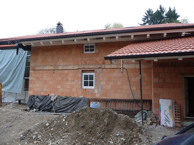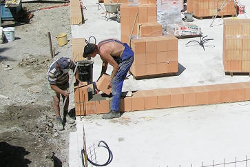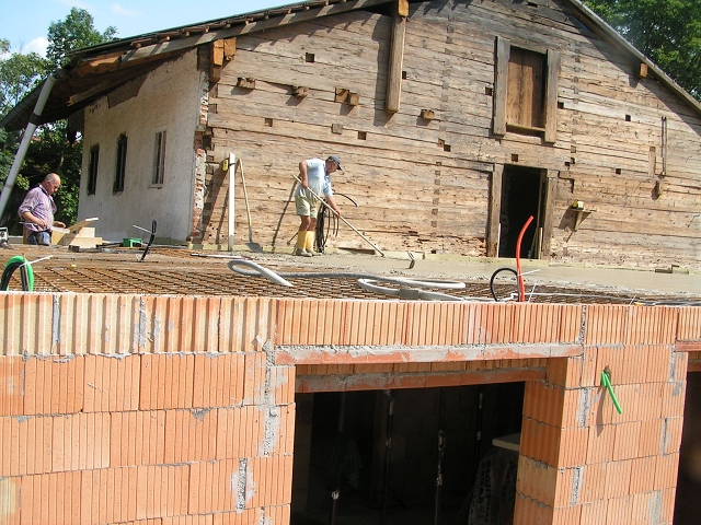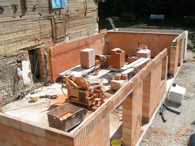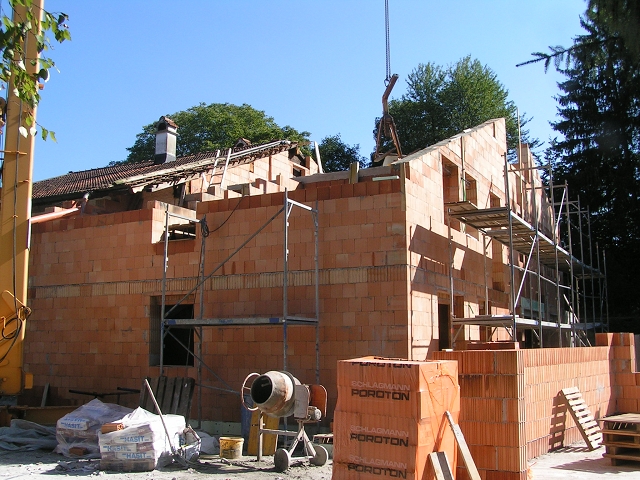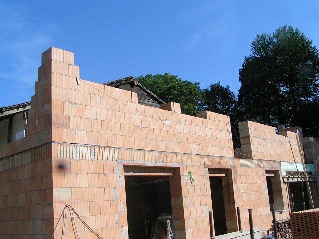 Das Haus ist bereits fertig gemauert. Hier kann der Zimmerer schon kommen. Jetzt müssen wir auch noch die Garage mit Zwischenbau noch fertig machen. | |
