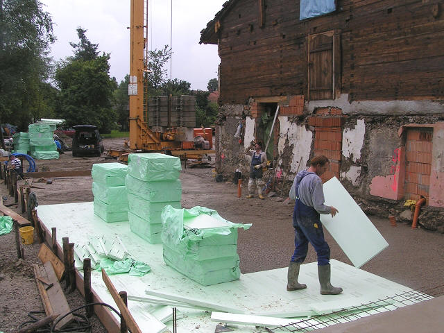 Der Wohntrakt war mit 2 Vollgeschossen mit 17 x 8.50 meter ohne Keller geplant. Auf die Einhaltung der Wärmeschutzberechnung wurde sehr genau geschaut. Deshalb wählten wir eine Flachgründung mit unterseitiger Dämmung. Die Außenwände wurden mit geüllten Ziegelsteinen Unipor W07 erstellt. Auf das Dach packte der Zimmerer 14 cm PU Hartschaumplatten drauf. Die Garage sollte ursprünglich unterkellert werden, damit man dort die Heizung einbauen kann. Ein Unterfangen, das schon beim ausbaggern scheiterte. An der Baugrubensohle gab es nur wässrigen Mehlsand. Darauf kann man kein Gebäude stellen. Deshalb wollten wir den Sand durch tragfähigen Kies ersetzen. Deshalb wurde noch tiefer ausgehoben. dort wurde es aber immer nässer und das Wasser schwemmte den Sand sogleich wieder ein. Wir hätten diese wasserführende Schicht nur mit hohen Kosten, einem enormen Materialaufgebot und mit Zeitverzögerung besiegen können. Ein Kosten - Nutzen - Vergleich machte schnell klar, das es günstiger ist die Heizung in der Garage eizubauen und diese dafür größer zu bauen. |