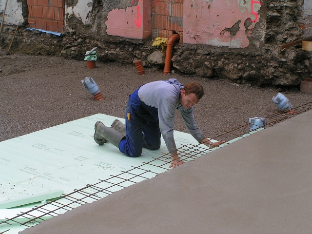 Nachdem ca 80meter Erdleitungen eingebaut waren konnten wir endlich mit dem eigentlichen Haus beginnen. Auf ein eben abgezogenes Splittplanum wurden 10cm dicke Styrodurplatten ausgelegt. Darauf dann eine Ober- und Unterbewehrung mit Q 257 Baustahlmatten. Verbunden wurde alles mit Wasserundurchlässigen Beton B25/30. | |