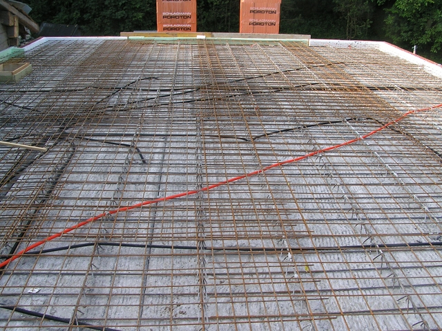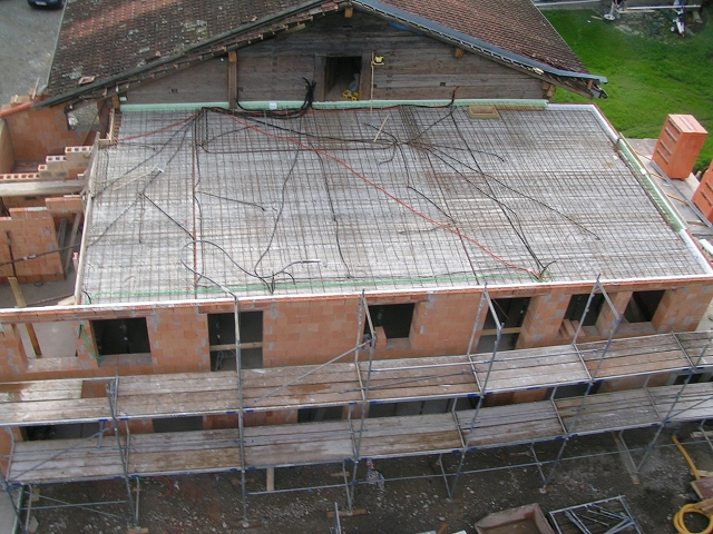 Die Obergeschossdecke ist verlegt und die Bewehrung eingebaut. Hier sieht man auch sehr schön die Leerrohre, die der Elektriker eingebaut hat. |