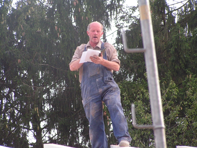Nach erfolgreicher Verhandlung habe ich noch einen Richtspruch vom First herunter gehalten und mit einem Schnaps begossen, der von Bauherrin gebracht wurde. Eine Anzahl von netten Richtsprüchen finden sie bei den "Verborgenen Schätzen." |