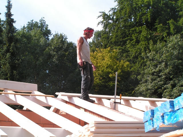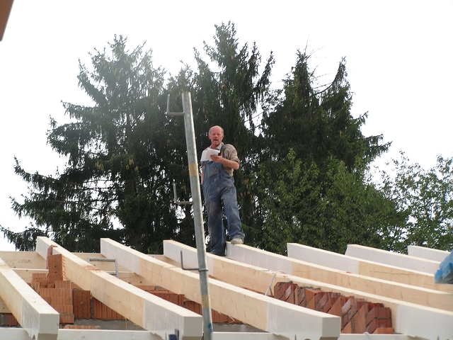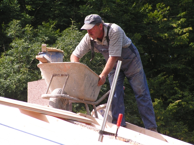 Beim Dachstuhl der Garage wird der First noch ausgemauert und der Kamin fertig gestellt. |