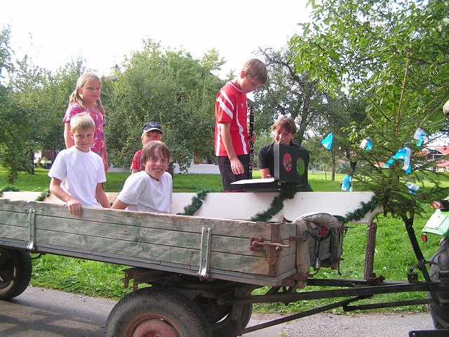 Die Nachbarn hatten nach altem Brauch ein Holzstück gestohlen und hatten es mit Girlanden und einem Firstboschen geschmückt. |