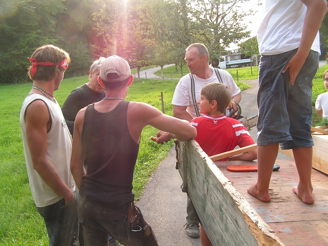 Der Bauherr holte sich beim Zimmerer rat. Daraufhin einigten sich die Diebe mit dem Bauherrn auf sofortige Verpflegung mit Brotzeit und Getränken und auf eine anständige Hebfeier. | |