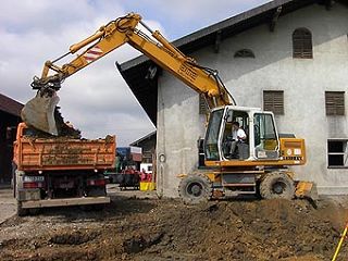 Fa Martin Maier macht den Erdaushub für die Gosse und den Heizraum. Im Bagger der 14-jährige Sohn des Unternehmers.