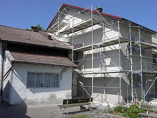 Der Bauherr hilft bei den Gerüstarbeiten mit. | |