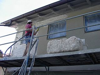 Der Grundputz mit Hasit 620 und 655 ist fertig. Auch beim Nachbarhaus wurde der Putz ausgebessert. | |
