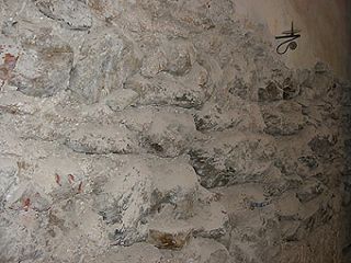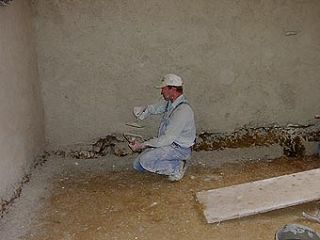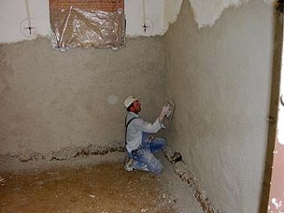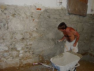 Auf das Bummerl- und Nagelfluhmauerwerk wird ein Putzsystem aufgebracht, das aus reinem Kalkmörtel aufgebaut ist. Hier im Bild wird gerade ein Spritzwurf aufgebracht, der außer Sumpfkalk und Sand keine weiteren Zusätze enthält. | |
