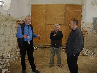 Architekt Helmut Mück / Tittmoning erklärt dem Vertreter des Kirchensprengels und Pfarrer Schinagl den Ablauf der weiteren Arbeiten (v. l. n. r. ) | |