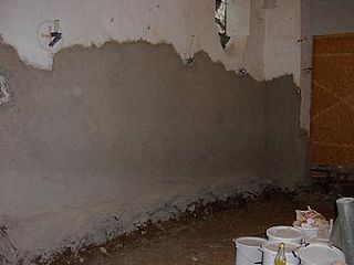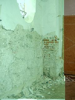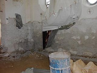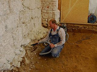 Putzmischung soll die Mauerwerksfeuchtigkeit minimiert werden. Hier untersucht Herr Höpfler gerade das Nagelfluhmauerwerk nach den Hausschwamm. |