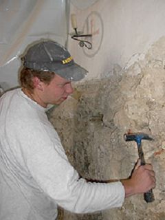 Mit einem Zimmererhammer wird in feiner Handarbeit das kontaminierte Fugenmaterial zwischen den Steinen von Josef entfernt. Der Ingenieurstudent sammelt bei seiner nebenberuflichen Tätigkeit Erfahrung von Sanierungen. | |