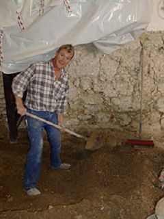 Der Lehmboden wird in Handarbeit ca 20 cm tief ausgekoffert. Loser Aushub wird mit dem Besen zusammengekehrt. | |