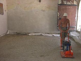 Auf den Lehmboden wurde ein Filtervlies ausgelegt und mit 40 cm Splitt 5/12 aufgefüllt und verdichtet. | |