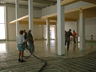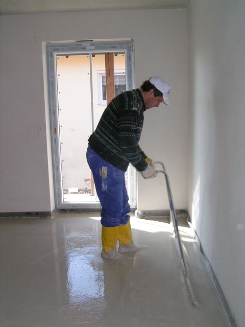 Sofort nach dem Verguss wird mit "Schwabbelstangen" der flüssige Estrich in Bewegung gesetzt. Dadurch entsteht die fertig glatte Oberfläche. | |