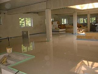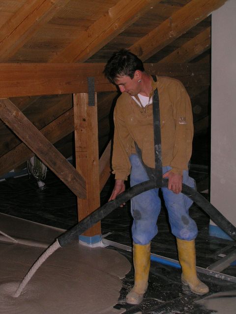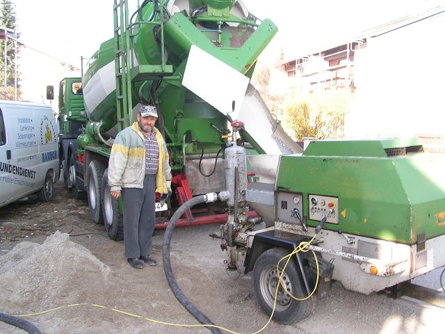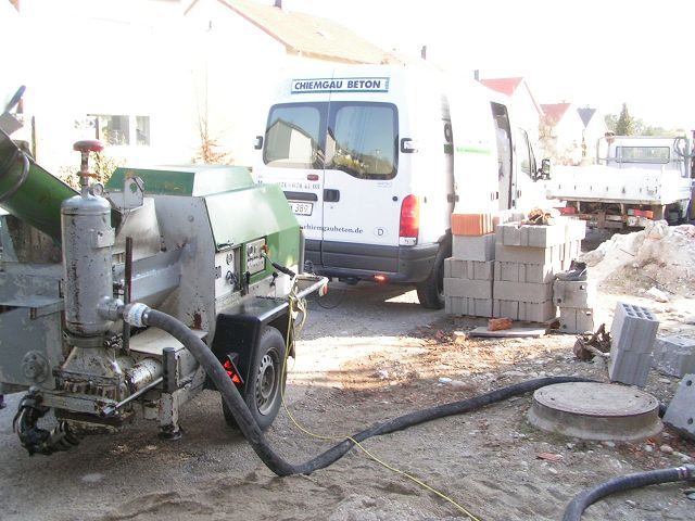Die Firma " Chiemgau Beton " stellt die Förderpumpe mit Bedienungspersonal. Bei " Fliesestrich" braucht man kein Estrichgitter auslegen oder Fasern in den Beton einmischen. |