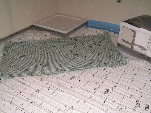 Die Fußbodenheizung und Dämmung muß auf den Fliesestrich abgestimmt sein. Ansonsten besteht die Gefahr, das die Rohre aufschwimmen. Auch die Randstreifen müssen mit einem Klebeband abgedichtet werden. Bei Türschwellen und Sollbruchstellen werden Kartonwinkel eingebaut. |