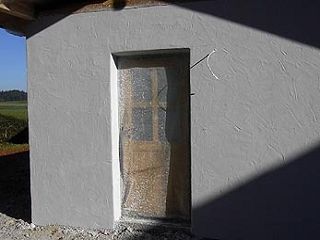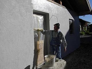 Auf den Grundputz wird das fertig weiße Strukturmaterial mit der |