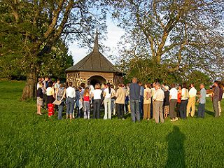 So viele Gläubige hatten in der kleinen Kapelle nicht platz. Deshalb wurde bei herrlichem Sonnenschein die Zeremonie im Freien abgehalten. | |