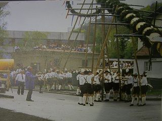 ![]() Ein Maibaum wird erstmals wieder 1983 in Trostberg aufgestellt. Die Feichtner hatten ihn gestohlen. |